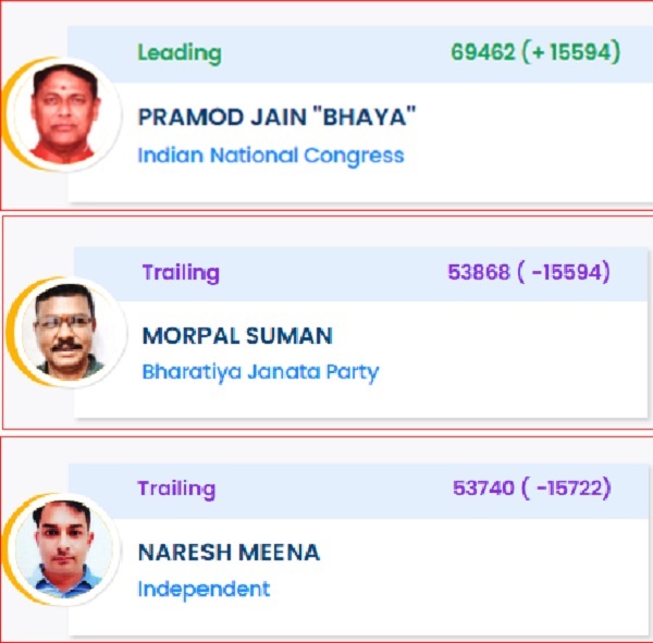 अंता ,14 नवंबर(आरएनएस)। विधानसभा उपचुनाव में कांग्रेस उम्मीदवार प्रमोद जैन भाया ने निर्णायक जीत दर्ज की है। भाया ने भाजपा उम्मीदवार मोरपाल सुमन को 15,594 वोटों के बड़े अंतर से हराया। निर्दलीय उम्मीदवार नरेश मीणा तीसरे नंबर पर रहे। काउंटिंग के दौरान माहौल बिल्कुल अलग-अलग भावनाओं से भरा दिखा। निर्दलीय नरेश मीणा मतगणना केंद्र के बाहर काफी निराश नजर आए और समर्थकों से घिरे जीप पर बैठे दिखे। वहीं दूसरी ओर, प्रमोद जैन भाया के समर्थकों में जीत को लेकर उत्साह और खुशी का माहौल रहा। नतीजे सामने आने के बाद राजनीतिक प्रतिक्रियाएं भी आईं। भाजपा प्रदेशाध्यक्ष मदन राठौड़ ने कहा कि वे जनता का आदेश स्वीकारते हैं। दूसरी ओर, पीसीसी चीफ गोविंद सिंह डोटासरा ने प्रमोद जैन भाया को जीत की बधाई दी।