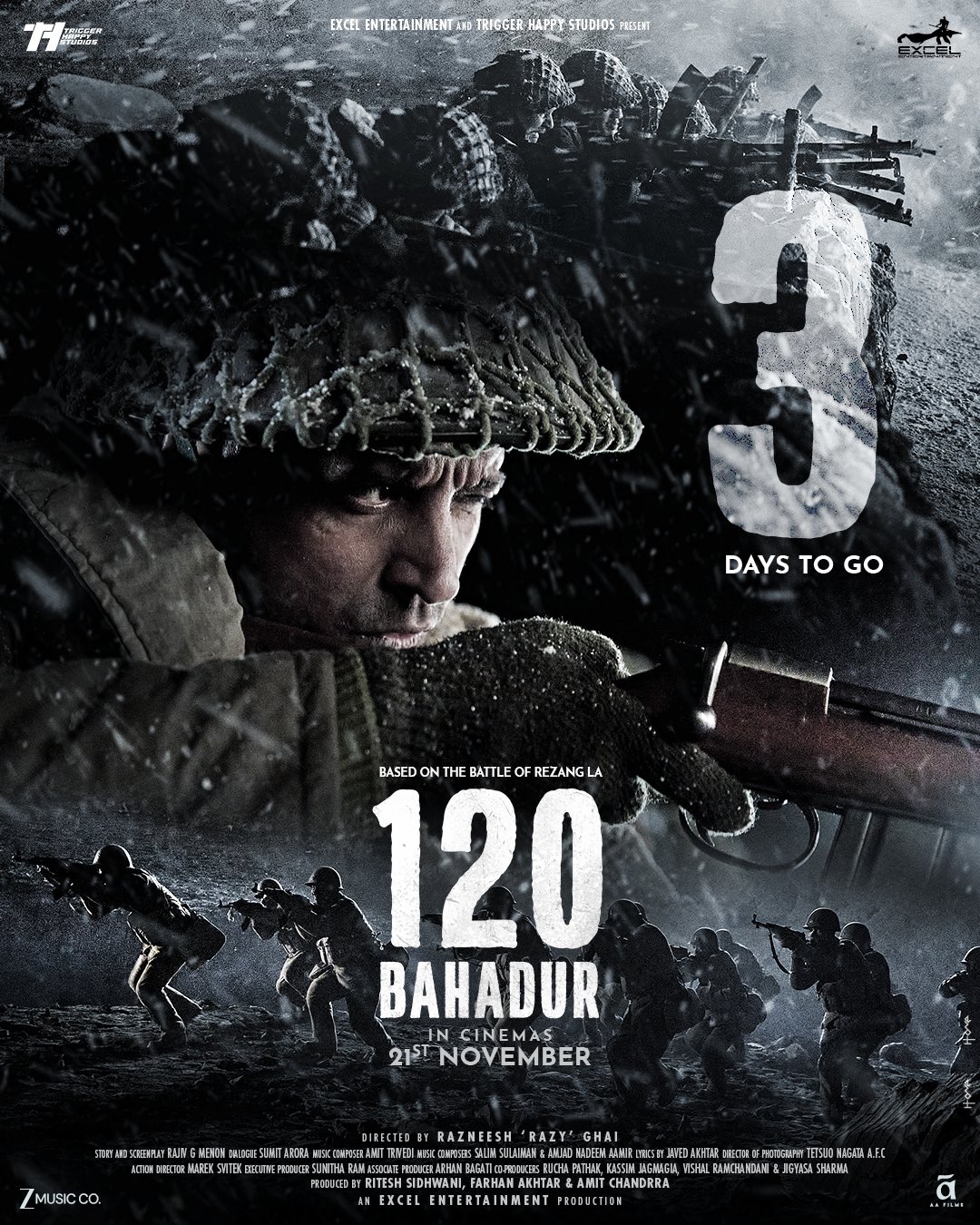 फरहान ने 120 बहादुर का नया पोस्टर साझा करते हुए लिखा, आज से 63 साल पहले रेजांग ला में इतिहास लिखा गया था। अविश्वसनीय सच्ची कहानी पर आधारित, इस कहानी को 3 दिनों में बड़े पर्दे पर देखें। जाहिर है कि भारत-चीन के बीच रेजांग ला की लड़ाई 18 नवंबर, 1962 को हुई थी। युद्ध में 120 भारतीय जवानों ने 3,000 चीनी सैनिकों का मुकाबला किया था। इसी युद्ध पर आधारित 120 बहादुर 21 नवंबर को रिलीज हो रही है।