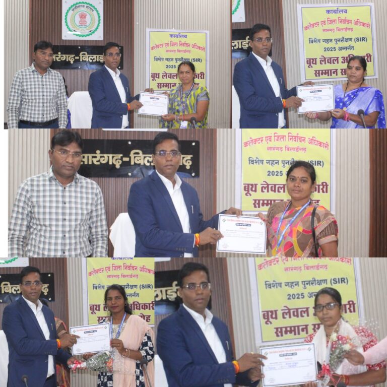 सारंगढ़ बिलाईगढ़, 22 नवंबर 2025(आरएनएस) कलेक्टर डॉ. संजय कन्नौजे ने सारंगढ़ बिलाईगढ़ जिले के विधानसभा 17 सारंगढ़ में 100 प्रतिशत एसआईआर कार्य को पूर्ण करने वाली मथुरा पटेल को कलेक्टोरेट सभाकक्ष में सम्मानित किया। बीएलओ मथुरा ने ग्राम रेंगालमुड़ा मतदान क्रमांक 221 में 476 मतदाताओं का एसआईआर पूर्ण की हैं। इसके साथ साथ जिले के 4 अन्य बीएलओ को भी सम्मानित किया गया जिन्होंने अपने कार्य में अच्छा प्रगति लाई हैं। इनमें बीएलओ सहारतीन अनंत ने डंगनिया के 454 मतदातओं के 76 प्रतिशत और बीएलओ विमला पटेल ने पिकरीमाल में 504 मतदाताओं के 41 प्रतिशत कार्य पूर्ण की हैं। इसी प्रकार विधानसभा 43 बिलाईगढ़ क्षेत्र में बीएलओ मेनका ठाकुर ने तेन्दूदरहा के 980 मतदाताओं के 76 प्रतिशत और बीएलओ मंगली रत्नेश ने मंधाईभाठा के 1027 मतदाताओं के 67 प्रतिशत एसआईआर कार्य पूर्ण की है। इस अवसर पर अपर कलेक्टर एवं उप जिला निर्वाचन अधिकारी प्रकाश सर्वे, डिप्टी कलेक्टर शिक्षा शर्मा उपस्थित थीं।