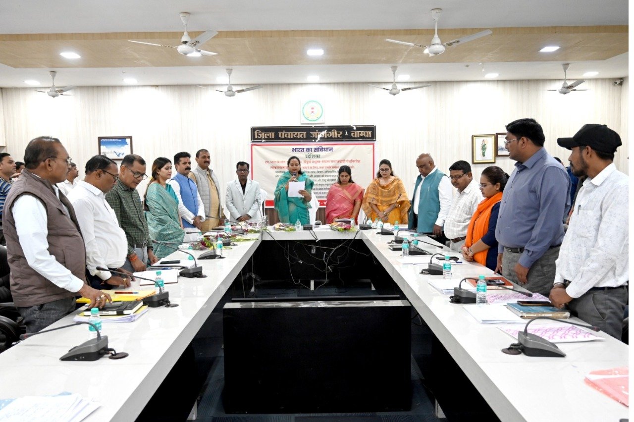 जांजगीर-चांपा, 26 नवम्बर 2025(आरएनएस ) जिले में संविधान दिवस पर जिला स्तरीय कार्यक्रम जिला पंचायत सभाकक्ष में आयोजित किया गया, जिसमें जिला पंचायत अध्यक्ष इंजीनियर सत्यलता आनंद मिरी ने संविधान की उद्देशिका का वाचन किया और सभी को संविधान दिवस की शुभकामनाएं दीं। जिला से लेकर जनपद, नगर पंचायत, नगर पालिका और ग्राम पंचायत स्तर पर भी संविधान दिवस मनाया गया तथा क्विज गतिविधियों का आयोजन किया गया। कार्यक्रम के दौरान जनप्रतिनिधियों ने संविधान की महत्ता और उसके मूल्यों पर अपने विचार साझा करते हुए नागरिकों से कर्तव्यों के प्रति सजग रहने की अपील की। कार्यक्रम में जिला पंचायत सदस्य प्रियंका सिंह, जिला पंचायत सदस्य सुश्री आशा साव, पूर्व विधायक चुन्नीलाल साहू, इंजीनियर रवि पाण्डेय, श्रीमती प्रतिमा, सीईओ गोकुल रावटे, उप संचालक पंचायत अभिमन्यु साहू सहित अधिकारी-कर्मचारी उपस्थित रहे।