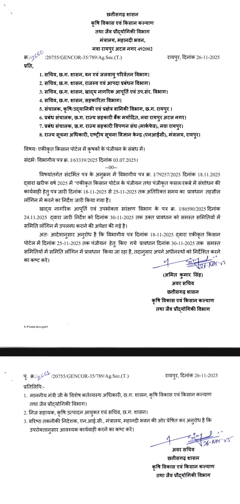 सारंगढ़ बिलाईगढ़, 26 नवंबर 2025(आरएनएस) खरीफ वर्ष 2025 में “एकीकृत किसान पोर्टल के पंजीयन तथा पंजीकृत फसल रकबे में संशोधन की कार्यवाही 18 नवंबर से 25 नवंबर 2025 तक अतिरिक्त समय का प्रावधान तहसील लॉगिन में करने का निर्देश जारी किया गया था, जिसे खाद्य नागरिक आपूर्ति एवं उपभोक्ता सरंक्षण विभाग के पत्र क्र. 1/86590/2025 दिनांक 24.11.2025 द्वारा जारी निर्देश को दिनांक 30-11-2025 तक उक्त प्रावधान को समस्त समितियों में समिति लॉगिन में उपलब्ध कराने कहा गया है। विभागीय पत्र दिनांक 18-11-2025 द्वारा एकीकृत किसान पोर्टल में दिनांक 25-11-2025 तक पंजीयन हेतु किए गये प्रावधान दिनांक 30-11-2025 तक समस्त समितियों में समिति लॉगिन में प्रावधान किया जा रहा है। कृषि विभाग ने इस संबंध में पत्र जारी किया है।