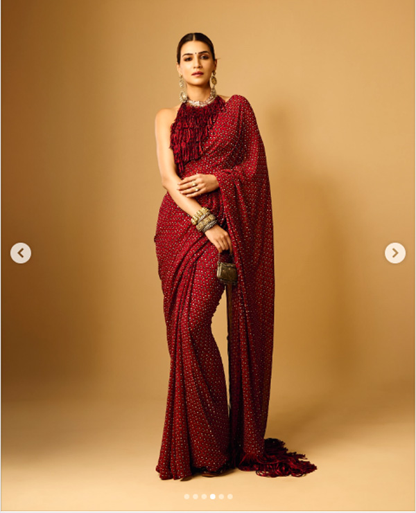 कृति सेनन ने इस बार बेहद खूबसूरत मैरून प्रिंटेड साड़ी को चुना, जिसमें उनका देसी लुक और भी निखरकर सामने आया. साड़ी का फ्लोई पल्लू और हल्का प्रिंट उनकी पर्सनैलिटी को खास ग्लैमर टच दे रहा है. एक्ट्रेस ने इसके साथ बैकलेस ब्लाउज कैरी किया, जिसकी पतली डोरी पर फैंस की नजरें टिक गई.