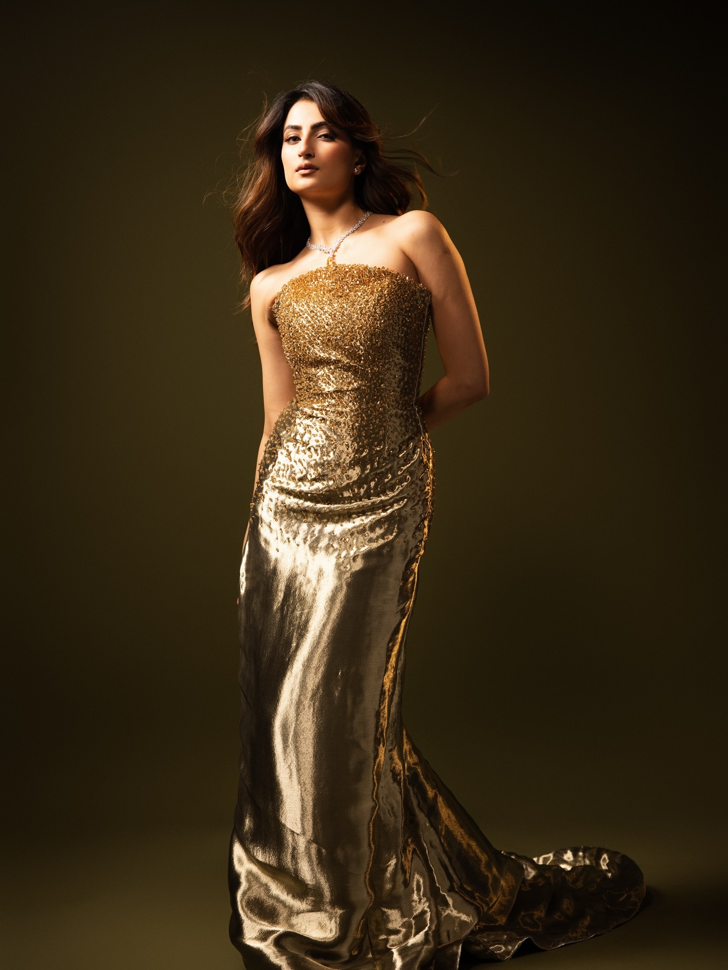 वायरल तस्वीरों में पलक एक स्ट्रैपलेस गोल्डन शिमरी गाउन पहने नजर आ रही हैं. गाउन का अपर पार्ट बॉडी-फिटेड है, जिस पर गोल्डन स्टोन्स की बारीक कारीगरी की गई है. ये स्टोन्स आउटफिट में एक रॉयल ग्लो एड कर रहे हैं. गाउन के लोअर पार्ट में थोड़ी स्पेसिंग के साथ स्टोन्स लगाए गए हैं और नीचे का फैब्रिक फ्लोई रखा गया है. लूज फिनिश और ट्रेल के साथ इस ड्रेस में एक ड्रामेटिक और स्टाइलिश टच भी देखा जा सकता है.