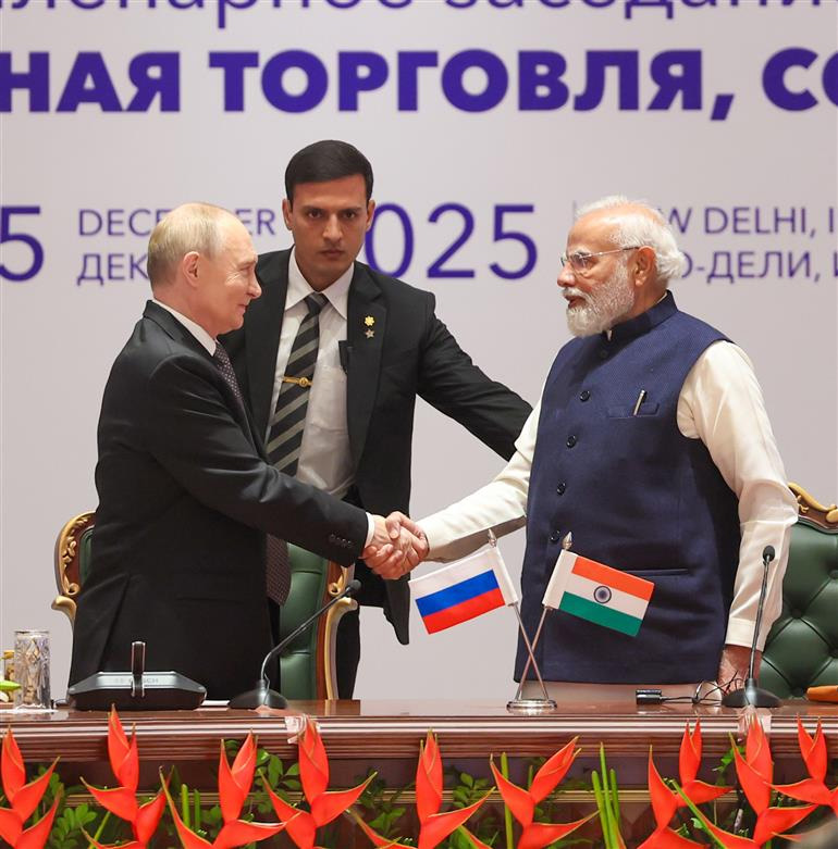 नईदिल्ली,05 दिसंबर (आरएनएस)। रूस के राष्ट्रपति व्लादिमीर पुतिन ने अपनी भारत यात्रा के दौरान आज प्रधानमंत्री नरेंद्र मोदी के साथ द्विपक्षीय बैठक की। हैदराबाद हाउस में हुई इस बैठक में दोनों देशों का प्रतिनिधिमंडल शामिल हुआ। इस दौरान भारत-रूस के बीच 7 अहम समझौते हुए। भारत ने रूसी पर्यटकों को 30 दिन तक मुफ्त वीजा जारी करने का भी ऐलान किया है। वहीं, रूस ने कहा कि वो कच्चे तेल की आपूर्ति जारी रखेगा।