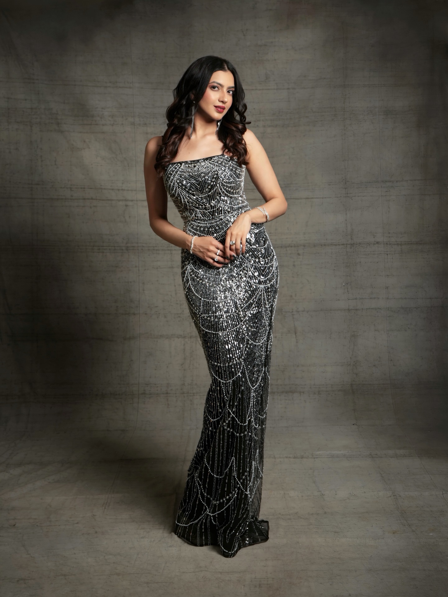 कभी-कभी फैशन कपड़े और कढ़ाई से आगे बढ़कर एक कहानी बन जाता है — और काशिका कपूर का यह लुक बिल्कुल वैसा ही एक पल है। काले रंग के दिलकश गाउन में, जिस पर बारीकी से की गई चांदी की कढ़ाई सितारों की तरह चमक रही थी, काशिका ने ओल्ड-हॉलीवुड की एलिगेंस और आधुनिक जादू का ऐसा मिश्रण रचा कि नजऱें ठहर जाएँ। उनका गाउन, पूरी तरह तराशा हुआ, उनके व्यक्तित्व के साथ ऐसे बहता है जैसे उनके इर्द-गिर्द रोशनी की नदी बह रही हो। हर पैटर्न, हर चमक उनके हर कदम के साथ जीवंत हो उठती है। हर तस्वीर मानो किसी सदाबहार फिल्म का स्थिर फ्ऱेम लगती है — संजीदा, खूबसूरत और बेमिसाल शालीनता से भरा हुआ। लेकिन इस लुक की असली खूबसूरती काशिका की मौजूदगी है। वह सिर्फ गाउन नहीं पहनतीं — वह उसे जीवन दे देती हैं। जब उनके हाथ नरम, बैले-सी मुद्रा में ऊपर उठते हैं और ठोड़ी हल्के-से प्रकाश की ओर झुकती है, तो पूरा माहौल एक मंच की तरह महसूस होने लगता है। उनके मुलायम कर्ल्स, नाज़ुक और सुरुचिपूर्ण ज्वेलरी, और मेकअप की हल्की, चमकती आभा — सब मिलकर एक ऐसा रूप रचते हैं जो एक साथ क्लासिक भी है और खगोलीय भी।