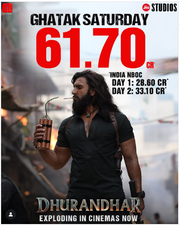 वहीं, मेकर्स ने धुरंधर का अपडेटेड कलेक्शन सोशल मीडिया पर साझा किया है. मेकर्स के मुताबिक, फिल्म ने पहले दिन 28.60 करोड़ रुपये का कलेक्शन किया था, जबकि दूसरे दिन फिल्म ने 33.10 करोड़ रुपये का बिजनेस किया है. इन दो दिनों में धुरंधर की कुल कमाई 61.70 करोड़ रुपये हो गई है.