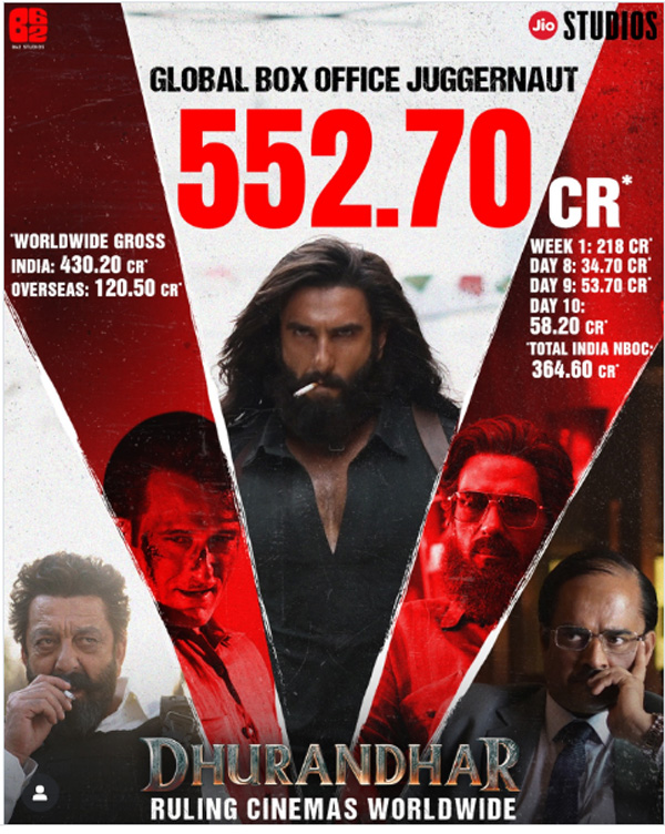 वहीं, फिल्म ने छठे दिन 29.20 करोड़ रुपये और सातवें दिन 29.40 करोड़ रुपये की कमाई की. ऑफिशियल आंकड़ों के अनुसार फिल्म का एक हफ्ते में भारत में कुल कलेक्शन 218.25 करोड़ रुपये हुआ. फिल्म ने आठवें दिन भी बॉक्स ऑफिस पर गदर मचाया और 34.70 करोड़ रुपये का कारोबार किया. नौवें दिन की कमाई बात करें तो फिल्म ने बॉक्स ऑफिस पर कमाई की हाफ सेंचुरी लगाई और 53.70 करोड़ रुपये कमाए. धुरंधर की अब तक की सबसे ज्यादा हाइएस्ट दैनिक कमाई मानी जा रही थी. इसी बीच धुरंधर ने 10वें दिन यानी दूसरे रविवार को 58.20 करोड़ रुपये कमाकर बॉक्स ऑफिस हिला डाला.