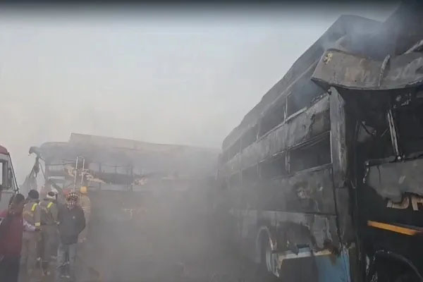 मथुरा 16 Dec, (Rns) : मथुरा में मंगलवार देर रात यमुना एक्सप्रेसवे पर घने कोहरे के कारण बड़ा सड़क हादसा हो गया। आगरा से नोएडा की ओर जा रही कई बसें और कारें आपस में टकरा गईं, जिसके बाद वाहनों में भीषण आग लग गई। इस दर्दनाक हादसे में 4 लोगों की मौत हो गई, जबकि करीब 25 यात्री घायल हो गए। सभी घायलों को उपचार के लिए अस्पताल में भर्ती कराया गया है और उनकी हालत फिलहाल खतरे से बाहर बताई जा रही है।