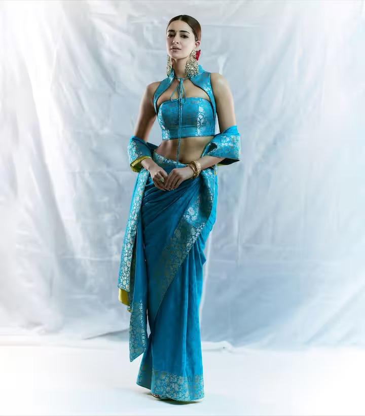 एक्ट्रेस ने इस बार ब्लू बनारसी साड़ी को चुना है, जिसमें बेहद बारीक गोल्डन जरी की कारीगरी की गई है. साड़ी पर किया गया हैंडवर्क इसे और भी एलिगेंट बना रहा है. अनन्या ने पल्लू को ट्रेडिशनल तरीके से नहीं, बल्कि रैप स्टाइल में लिया है, जिसमें उनका कर्वी फिगर फ्लॉन्ट हो रहा है.