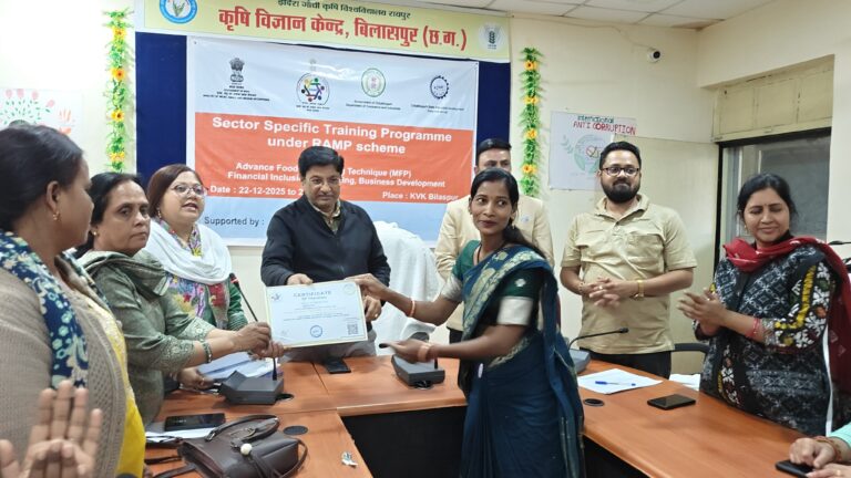बिलासपुर 27 दिसंबर 2025(आरएनएस) रैंप योजना अंतर्गत सेक्टर स्पेसिफिक ट्रेनिंग प्रोग्राम फूड प्रोसेसिंग में, कृषि विज्ञान केंद्र कोनी में संपन्न हुआ।यह प्रशिक्षण कार्यक्रम सीएसआईडीसी रायपुर अंतर्गत प्रशिक्षण पार्टनर एन आई एम एस एम ई हैदराबाद द्वारा आयोजित किया गया । कृषि विज्ञान केन्द्र के विषय विशेषज्ञों द्वारा फूड प्रोसेसिंग पर नई तकनीक, पैकेजिंग ,ब्रांडिंग मार्केटिंग और सर्टिफिकेशन पर प्रशिक्षण दिया गया । प्रशिक्षण उपरांत प्रतिभागियों को प्रमाण पत्र वितरण किया गया।