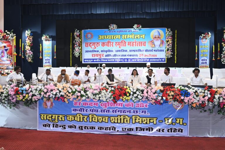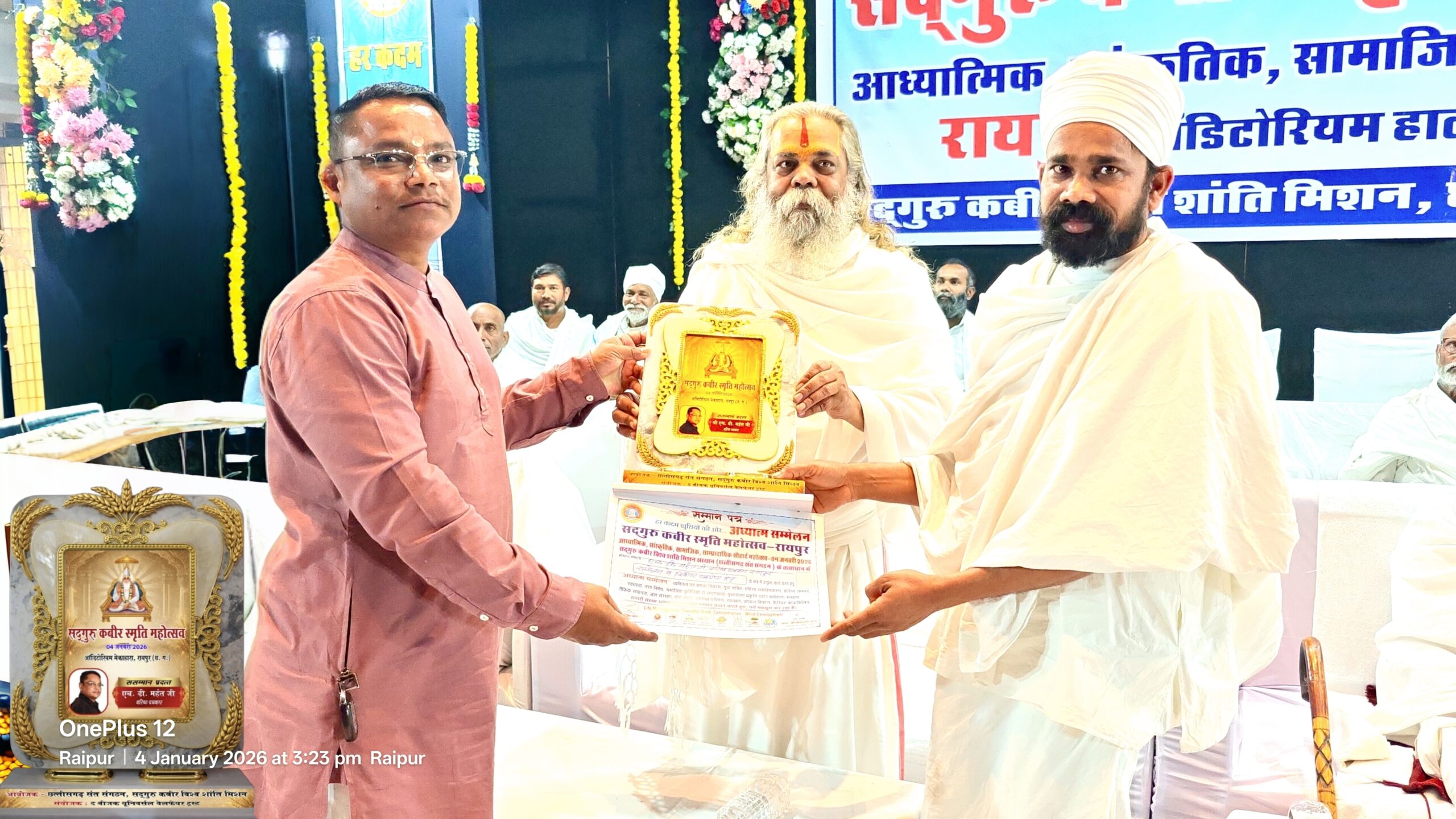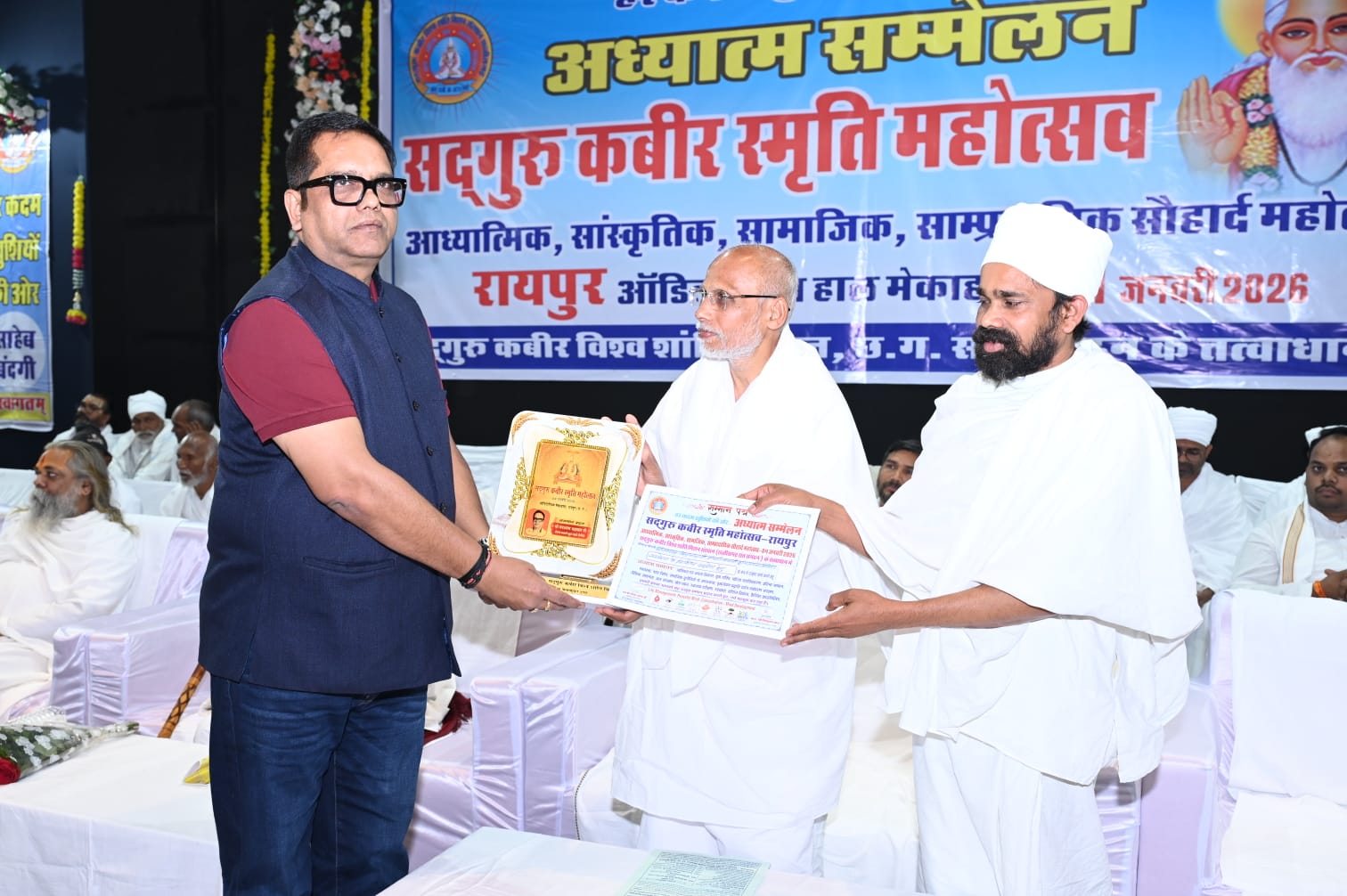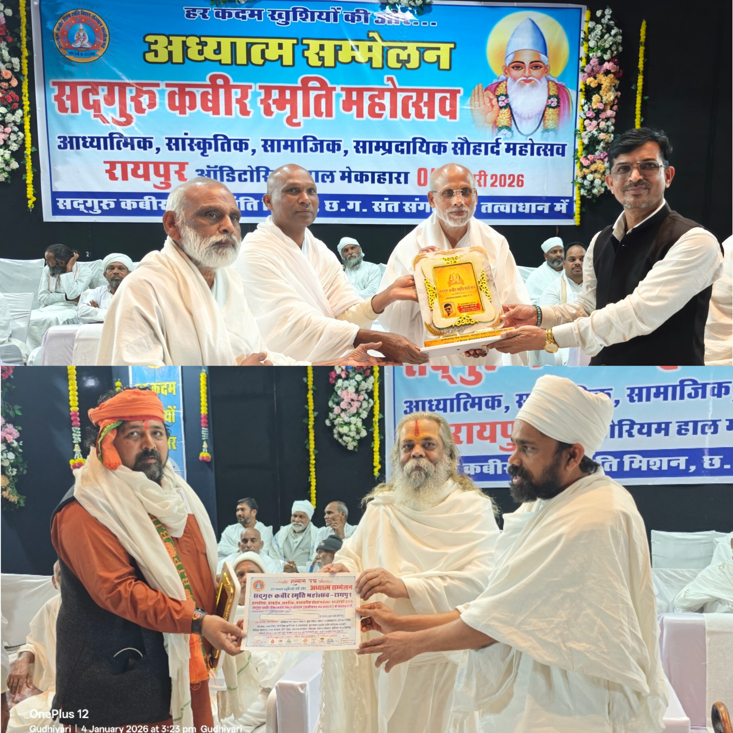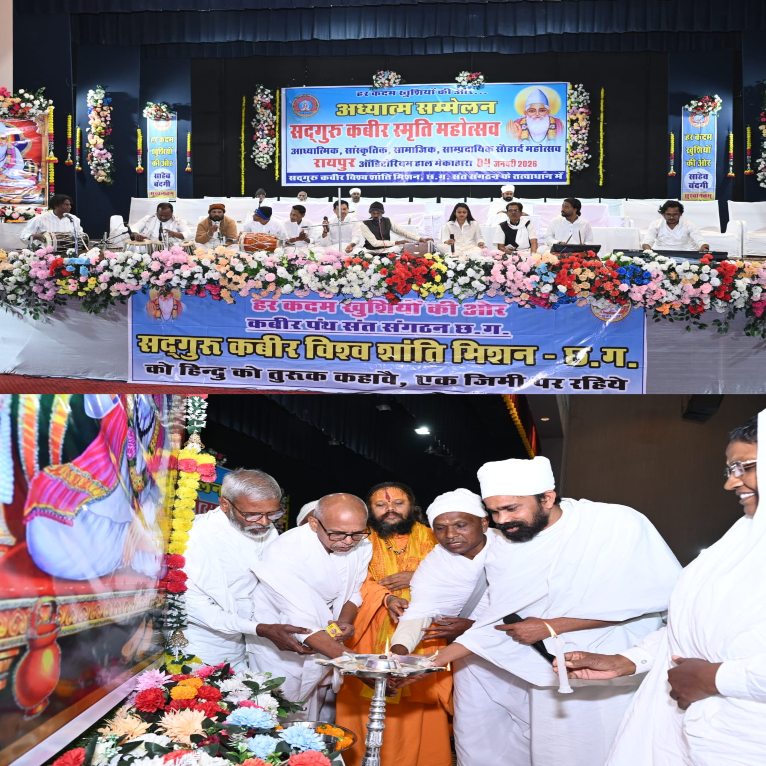 रायपुर, 05 जनवरी 2026 (आरएनएस) छत्तीसगढ़ संत संगठन के संयोजन में सद्गुरु कबीर विश्व शांति मिशन संस्थान द्वारा राजधानी रायपुर स्थित मेकाहारा सभागार में सद्गुरु कबीर स्मृति महोत्सव एवं आध्यात्मिक सम्मेलन का भव्य आयोजन किया गया। 4 जनवरी 2026 को प्रातः 11 बजे से अपराह्न 5 बजे तक चले इस आयोजन में प्रदेशभर से पहुंचे संत समाज के प्रतिनिधियों, सामाजिक संगठनों एवं हजारों श्रद्धालुओं की गरिमामयी उपस्थिति रही।