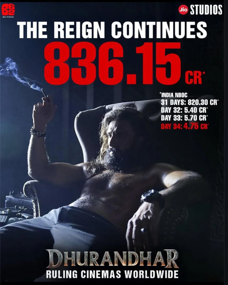 धुरंधर आज अपना 5वां हफ्ता पूरा करने जा रही है. धुरंधर ने बीते दिन पुष्पा 2 के हिंदी कलेक्शन को पछाडऩे के बाद बॉक्स ऑफिस पर अपना कहर जारी रखा है. धुरंधर ने डोमेस्टिक बॉक्स ऑफिस पर 34वें दिन 4.75 करोड़ रुपये का कलेक्शन किया है. इसी के साथ धुरंधर का घरेलू कलेक्शन 836.15 करोड़ रुपये हो गया है. धुरंधर का जलवा अभी जारी है. धुरंधर इंडियन सिनेमा की सिंगल भाषा में सबसे ज्यादा कमाई करने वाली एकमात्र फिल्म बन गई है. वहीं, धुरंधर वर्ल्डवाइड बॉक्स ऑफिस पर भारत की चौथी सबसे कमाऊ फिल्म बन गई है. फिल्म ने लिस्ट में आरआरआर को एक पायदान नीचे खिसका दिया है. अब धुरंधर के सामने दंगल, बाहुबली और पुष्पा 2 का रिकॉर्ड बचा है.