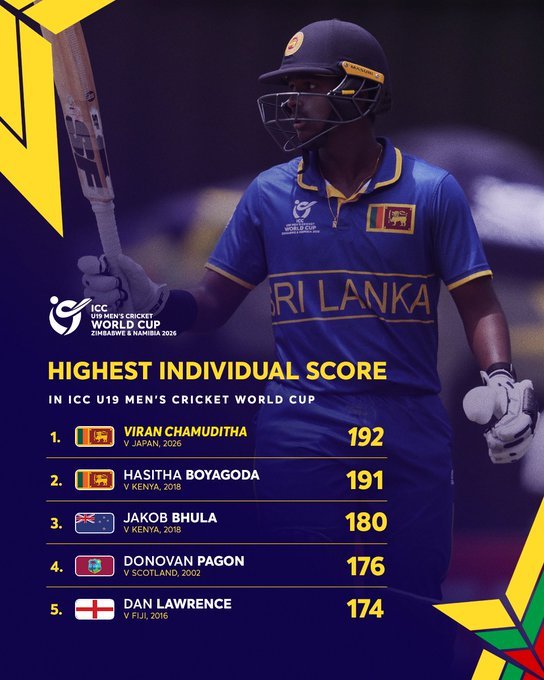 विंडहोक (नामीबिया),18 जनवरी। श्रीलंका के विरान चामुदिथा ने शनिवार, 17 जनवरी को जापान के खिलाफ मैच के दौरान अंडर 19 वर्ल्ड कप 2026 में इतिहास रच दिया. चामुदिथा ने 192 रन बनाए, जो अंडर 19 वर्ल्ड कप के इतिहास में अब तक का सबसे बड़ा व्यक्तिगत स्कोर है.