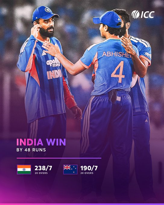 नागपुर,22 जनवरी। भारत पांच मैचों की टी20 सीरीज के पहले मैच में न्यूजीलैंड को 48 रनों से हराकर सीरीज में 1-0 की बढ़त बना ली है. नागपुर के विदर्भ क्रिकेट एसोसिएशन स्टेडियम में खेले गए पहले मैच में भारत ने टॉस हारकर पहले बल्लेबाजी करते हुए भारत ने 20 ओवर में 7 विकेट खोकर 238 रन बनाए.