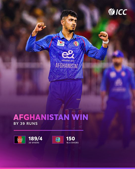 मैच की बात करें तो टॉस हारने के बाद अफगानिस्तान को पहले बल्लेबाजी की दावत मिली. जिसके बाद उन्होंने सिद्दीकुल्लाह अटल और दरवेश रसूली की फिफ्टी की बदौलत अपनी टीम का स्कोर 189/4 तक पहुंचा दिया. 190 रनों के लक्ष्य का पीछा करने उतरी वेस्टइंडीज की बैटिंग लाइन अप को अफगानी स्पिनर मुजीब उर रहमान ने चार विकेट लेकर तहस-नहस कर दिया. जिसमें उन्होंने अपने दो स्पेल में हैट्रिक भी ली. जिसकी वजह से वेस्टइंडीज के पूरी टीम 18.5 ओवर में 150 रनों पर ही ढेर हो गई.
