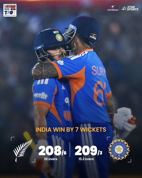 209 रनों के लक्ष्य का पीछा करने उतरी भारतीय टीम की शुरुआत काफी खराब रही थी, क्योंकि उसके दोनों ओपनर 6 रन के कुल स्कोर पर ही आउट हो गए थे. उसके बाद ईशान किशन और सूर्याकुमार यादव ने शानदार पारी खेलकर टीम को रिकॉर्ड जीत दिला दी. ईशान ने 32 गेंद में 76 रन बनाए, जिसमें 11 चौके और 4 छक्के शामिल थे. वहीं सूर्या ने 37 गेंद में नाबाद 82 रन बनाए, उन्होंने अपनी पारी में 9 चौके और 4 छक्के भी लगाए. उनके साथ शिवम दुबे 18 गेंद में 36 रन बनाकर नाबाद रहे.