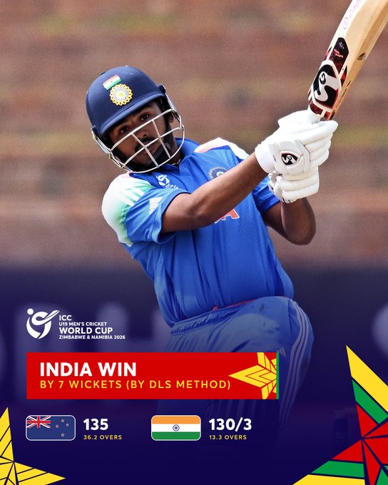 सूर्यवंशी और म्हात्रे के विकेट गिरने के बाद विहान मल्होत्रा और वेदांत त्रिवेदी की जोड़ी ने भारत की जीत सुनिश्चित की. उनकी साझेदारी की मदद से भारत ने सिर्फ 13.3 ओवर में 130 रन का लक्ष्य हासिल कर लिया. टूर्नामेंट में अपनी तीसरी जीत के साथ, भारत छह अंकों और +2.719 के नेट रन रेट के साथ ग्रुप में टॉप पर है.