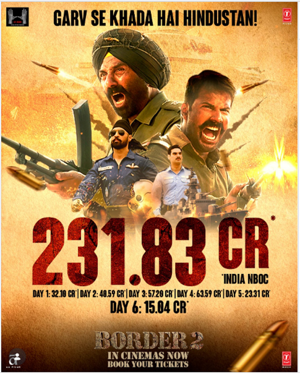 बॉर्डर 2 ने पहले ही दिन घरेलू बॉक्स ऑफिस पर 32.10 करोड़ रुपये से खाता खोला था. दूसरे दिन फिल्म ने 40.59 करोड़ रुपये कमाए और तीसरे दिन यानी पहले रविवार फिल्म ने 57.20 करोड़ रुपये कमाकर शानदार वीकेंड पूरा किया. बॉर्डर 2 ने पहले वीकेंड 129.80 करोड़ रुपये कमाए. फिल्म ने रपब्लिक डे पर 63.59 करोड़ रुपये की कमाई की थीं. पांचवें दिन मंगलवार को फिल्म ने 23.31 करोड़ रुपये का कारोबार किया. इसी के साथ बॉर्डर 2 का पांच दिनों का कुल नेट घरेलू ऑफिशियल कलेक्शन 216.79 करोड़ रुपये हो गया.अब सैकनिल्क की मानें तो फिल्म ने 13 करोड़ रुपये का कलेक्शन किया है. छठे दिन फिल्म का ऑक्यूपेंसी रेट 16.78 फीसदी रहा.