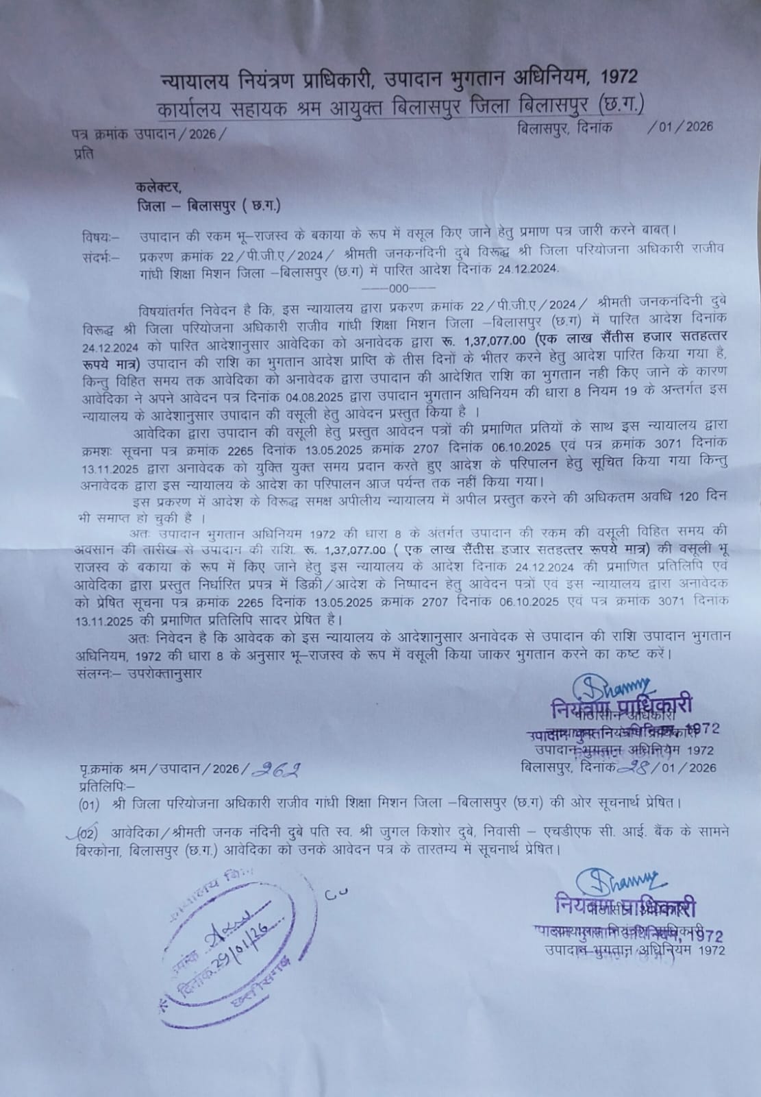 बिलासपुर 30 जनवरी 2026(आरएनएस) सेवानिवृत्ति महिला को सेवानिवृत्ति पेंशन/ग्रेच्युटी नहीं दिए जाने पर श्रम न्यायालय द्वारा पीड़िता के पक्ष में ग्रेच्युटी दिए जाने के आदेश के बावजूद विभाग द्वारा भुगतान की राशि नहीं दिए जाने का गंभीर मामला सामने आया है! पीड़िता ने कई बार इसके लिए संबंधित अधिकारियों से निवेदन किया लेकिन कई महीनो से केवल टालमटोल का रवैया अपनाया जा रहा है! महिला के समक्ष अब जीवन यापन की गंभीर समस्या सामने आ खड़ी हुई है।