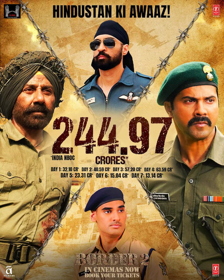 पांचवें दिन मंगलवार को फिल्म ने 23.31 करोड़ रुपये का कारोबार किया और छठे दिन बड़ी गिरावट के साथ 15.04 करोड़ रुपये कमाए. इसी के साथ बॉर्डर 2 का छह दिनों का नेट घरेलू ऑफिशियल कलेक्शन 231.83 करोड़ रुपये हो गया था. वहीं फिल्म ने सातवें दिन की 13.14 करोड़ रुपये की कमाई की और फिल्म भारत में 244.97 करोड़ रुपये कमा चुकी है.