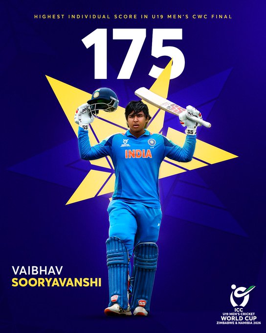 वैभव सूर्यवंशी ने 80 गेंदों में 175 रनों की शानदार पारी खेली, जिसमें 15 चौके और 15 छक्के शामिल थे. इस तूफानी पारी के दौरान, वैभव ने तीन बड़े रिकॉर्ड ध्वस्त कर दिए. वो अब अंडर 19 में सबसे तेज 150 रन बनाने वाले खिलाड़ी बन गए. इसके अलावा उन्होंने इस टूर्नामेंट की एक पारी में सबसे ज्यादा छक्के मारने का भी रिकॉर्ड अपने नाम कर लिया है. तीसरा रिकॉर्ड ये कि वो अंडर-19 वर्ल्ड कप फाइनल में सबसे तेज शतक जडऩे वाले बल्लेबाज भी बन गए.