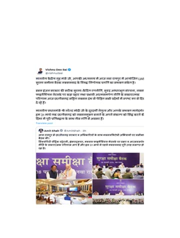 मुख्यमंत्री ने प्रधानमंत्री नरेन्द्र मोदी के नेतृत्व और केंद्रीय गृह मंत्री के मार्गदर्शन का उल्लेख करते हुए भरोसा जताया कि राज्य सरकार 31 मार्च तक छत्तीसगढ़ को नक्सलमुक्त बनाने के संकल्प की दिशा में पूरी प्रतिबद्धता के साथ तेजी से आगे बढ़ रही है।