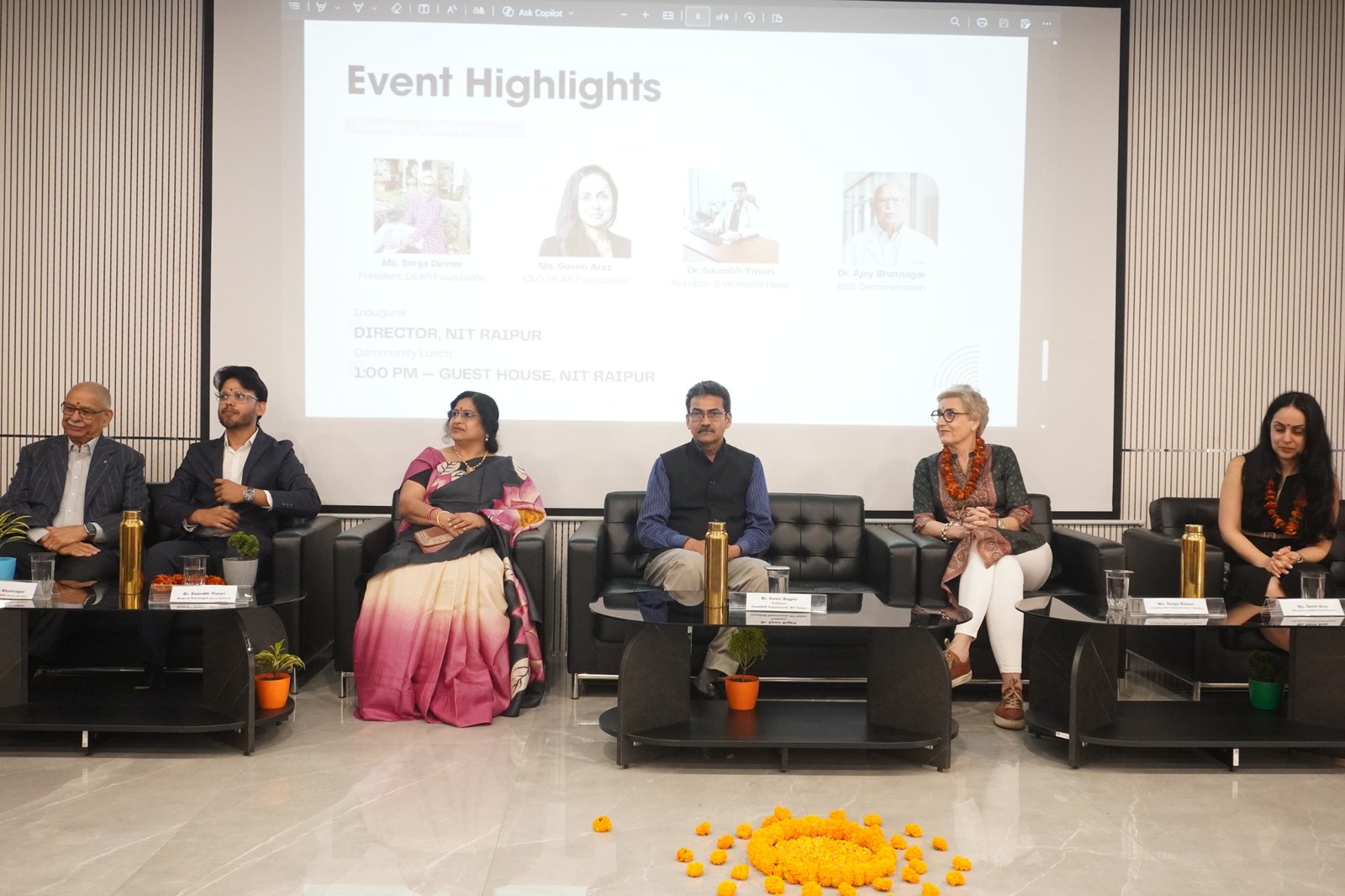कार्यक्रम में डॉ. समीर बाजपेई, निदेशक (प्रभारी), एन आई टी रायपुर, सोनजा डिनर, अध्यक्ष, द डियर फाउंडेशन, स्विट्जरलैंड, सेविम अराज़, मुख्य कार्यकारी अधिकारी , द डियर फाउंडेशन, स्विट्जरलैंड, डॉ. अजय भटनागर, वैज्ञानिक सलाहकार, द डियर फाउंडेशन, स्विट्जरलैंड , डॉ सौरभ तिवारी, मेडिकल ऑन्कोलॉजिस्ट, बाल्को कैंसर सेंटर और श्रीमती ज्योति रमना राव उपस्थित रही | इसके साथ ही डॉ एन डी लोंढे, रजिस्ट्रार, एन आई टी रायपुर, डॉ. सुधाकर पांडे, हेल्थकेयर एडवाइजरी कमेटी एनआईटी रायपुर के अध्यक्ष और विभागाध्यक्ष, सूचना प्रोद्योगिकी विभाग, डॉ. अनूप कुमार तिवारी, एसोसिएट प्रोफेसर, ह्यूमैनिटीज एंड सोशल साइंस और अध्यक्ष, ब्रेस्ट कैंसर जागरूकता कैंप, डॉ. मृदु साहू, असिस्टेंट प्रोफेसर, सूचना प्रोद्योगिकी विभाग और कार्यक्रम समन्वयक, ब्रेस्ट कैंसर जागरूकता कैंप, फैकल्टी सदस्य एवं छात्र-छात्राएं भी बड़ी संख्या में उपस्थित रहे।