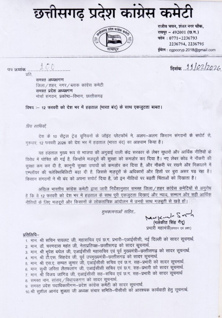 रायपुर, 11 फरवरी (आरएनएस)। छत्तीसगढ़ प्रदेश कांग्रेस कमेटी ने 12 फरवरी को प्रस्तावित राष्ट्रव्यापी हड़ताल (भारत बंद) के समर्थन में प्रदेश भर की पार्टी इकाइयों को निर्देश जारी किए हैं। इस संबंध में प्रदेश कांग्रेस की ओर से सभी जिला, शहर, नगर और ब्लॉक कांग्रेस कमेटियों के अध्यक्षों तथा मोर्चा-संगठनों को पत्र भेजकर आंदोलन के साथ एकजुटता प्रदर्शित करने का आह्वान किया गया है।