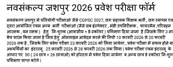 नवसंकल्प जशपुर में प्रतियोगी परीक्षाओ जैसे ष्टत्रक्कस्ष्ट 2027, छग सहायक शिक्षक भर्ती , छग व्यापम एवम द्वरा आयोजित एवम अन्य भर्ती परीक्षाओ (जैसे सब इंस्पेक्टर , मंडी उपनिरीक्षक , फायरमैन ,परिवहन आरक्षक , वन रक्षक ) हेतु नि:शुल्क (आवासीय + डे-स्कॉलर ) प्रशिक्षण दिया जाना है 7जिसके लिए 3 नए बैच प्रारंभ किया जाना है जिस हेतु ऑनलाइन आवेदन करने की तिथी 10 फऱवरी 2026 से 20 फरवरी 2026 तक है , जिसके लिए प्रवेश परीक्षा 23 फऱवरी 2026 को लिया जायेगा , प्रवेश परीक्षा में सफल होने वाले अभ्यर्थियों का इंटरव्यू 25 फऱवरी 2026 से 28 फरवरी 2026 तक लिया 7 प्रवेश परीक्षा एवम इंटरव्यू के आधार पर 50 ( 24 छात्र + 26 छात्राओ) को हॉस्टल में प्रवेश दिया जायेगा व अन्य छात्र डे स्कॉलर नि:शुल्क प्रशिक्षण प्राप्त करेंगे 7 कृपया इस फॉर्म को अधिक से अधिक शेयर करें 7 नीचे लिंक पर क्लिक करके फॉर्म भरें