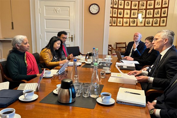 नॉर्वे के वित्त मंत्री जेन्स स्टोलटेनबर्ग के साथ अपनी मुलाकात के दौरान, उन्होंने नवीकरणीय ऊर्जा क्षेत्र, विशेष रूप से सौर ऊर्जा, रेयर अर्थ प्रोसेसिंग, कार्बन कैप्चर और स्टोरेज में साथ मिलकर काम करने पर चर्चा की।