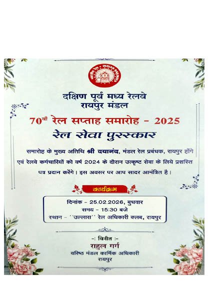 रायपुर, 25 फरवरी (आरएनएस)। दक्षिण पूर्व मध्य रेलवे के रायपुर मंडल द्वारा 70वां रेल सप्ताह पुरस्कार 2025 (मंडल रेल प्रबंधक स्तर) का आयोजन आज 25 फरवरी 2026, बुधवार को किया जा रहा है। यह समारोह दोपहर 3:30 बजे उल्लास रेलवे अधिकारी क्लब, शिवनाथ रेल विहार, डब्ल्यूआरएस कॉलोनी, रायपुर में आयोजित होगा।