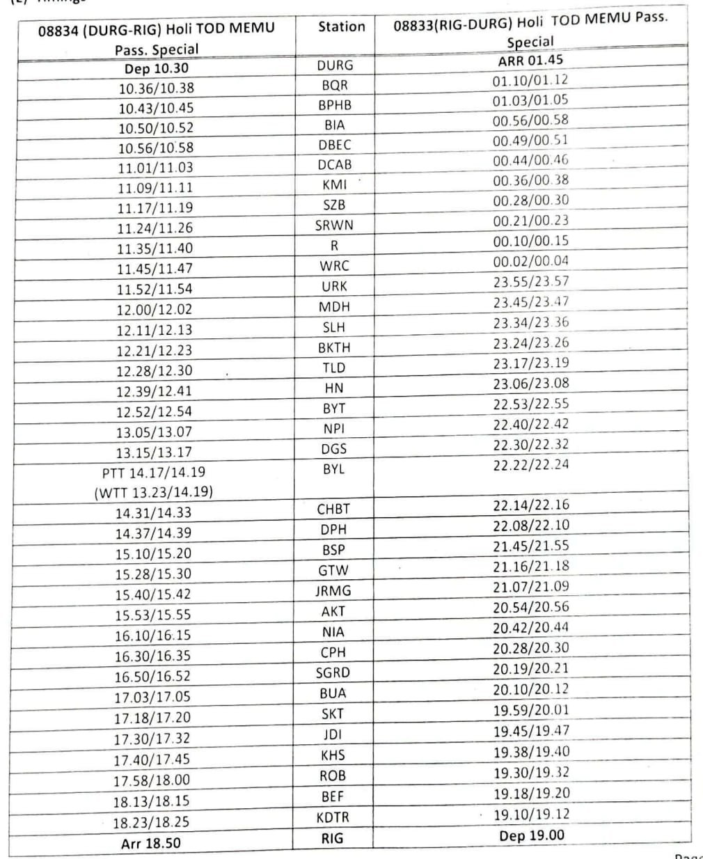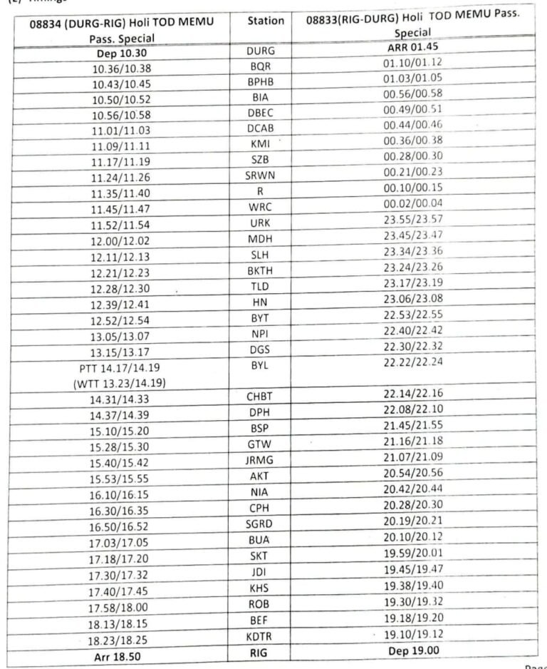 दिनांक 02, 03, 05 एवं 06 फरवरी 2026 को वापसी में गाड़ी संख्या 08833 रायगढ़- दुर्ग मेमू पैसेंजर स्पेशल रायगढ़ से 19:00 रवाना होकर उपरोक्त सभी स्टेशनों पर रुकते हुए बिलासपुर 21.45 बजे एवं रायपुर 00:10 बजे और दुर्ग अगले दिन 01.45 बजे पहुंचेगी।