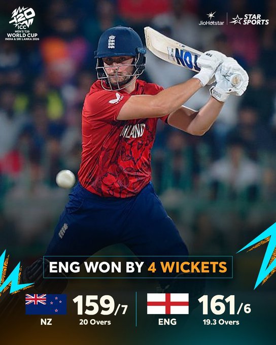 नईदिल्ली,28 फरवरी। टी-20 विश्व कप 2026 के 49वें मैच में इंग्लैंड क्रिकेट टीम ने न्यूजीलैंड क्रिकेट टीम को 4 विकेट से हराते हुए सुपर-8 में अपनी लगातार तीसरी जीत दर्ज की। प्रेमदासा स्टेडियम में हुए मैच में कीवी टीम ने पहले बल्लेबाजी करते हुए 159/7 का स्कोर बनाया। जवाब में इंग्लैंड की टीम ने 19.3 ओवर में लक्ष्य हासिल किया। यह सुपर-8 में न्यूजीलैंड की पहली हार साबित हुई। आइए मैच में बने रिकॉर्ड्स पर एक नजर डालते हैं।