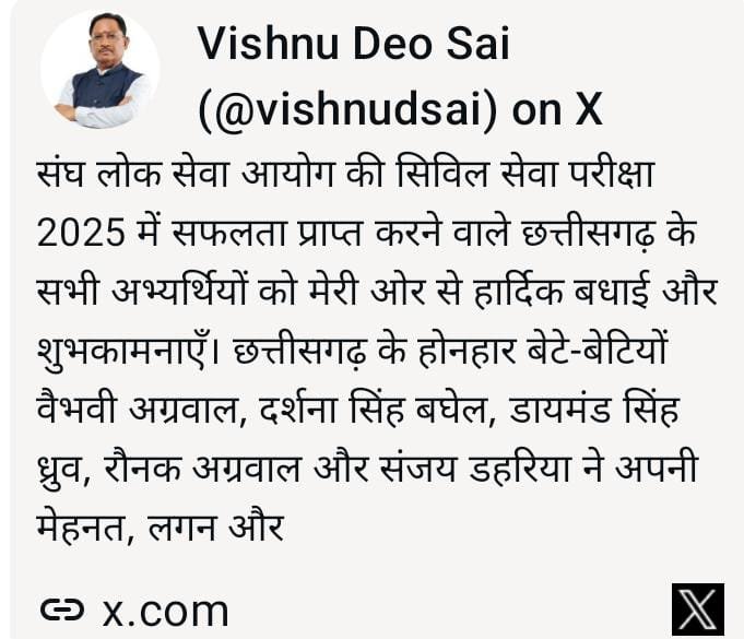 रायपुर, 06 मार्च (आरएनएस)। मुख्यमंत्री विष्णु देव साय ने संघ लोक सेवा आयोग (यूपीएससी) की सिविल सेवा परीक्षा 2025 में सफलता प्राप्त करने वाले छत्तीसगढ़ के सभी अभ्यर्थियों को हार्दिक बधाई और शुभकामनाएँ दी हैं। मुख्यमंत्री विष्णुदेव साय ने कहा कि प्रदेश के प्रतिभाशाली युवाओं ने अपनी मेहनत, लगन और दृढ़ संकल्प के बल पर यह उपलब्धि हासिल कर पूरे छत्तीसगढ़ का गौरव बढ़ाया है। मुख्यमंत्री श्री साय ने वैभवी अग्रवाल, दर्शना सिंह बघेल, डायमंड सिंह ध्रुव, रौनक अग्रवाल और संजय डहरिया को उनकी उल्लेखनीय सफलता के लिए बधाई दी है। उन्होंने कहा कि इन होनहार बेटे-बेटियों की उपलब्धि प्रदेश के युवाओं के लिए प्रेरणादायक है और यह दिखाती है कि निरंतर परिश्रम और लक्ष्य के प्रति समर्पण से किसी भी ऊँचाई को प्राप्त किया जा सकता है। मुख्यमंत्री विष्णु देव साय ने सभी सफल अभ्यर्थियों के उज्ज्वल भविष्य की कामना करते हुए कहा कि उनकी उपलब्धि छत्तीसगढ़ के युवाओं को बड़े लक्ष्य निर्धारित करने और उन्हें हासिल करने के लिए प्रेरित करती है। मुख्यमंत्री ने कहा कि इन युवाओं की सफलता केवल व्यक्तिगत उपलब्धि नहीं है, बल्कि यह प्रदेश के लाखों विद्यार्थियों के सपनों को नई ऊर्जा और दिशा देने वाली प्रेरणा है। उन्होंने आशा व्यक्त की कि ये सभी प्रतिभाशाली युवा प्रशासनिक सेवाओं में रहते हुए पूरी निष्ठा और समर्पण के साथ जनसेवा करेंगे तथा राष्ट्र निर्माण में महत्वपूर्ण योगदान देंगे।