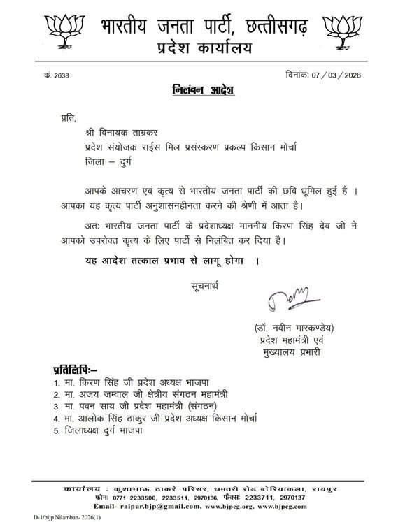 प्रदेश भाजपा अध्यक्ष किरण सिंह देव के निर्देश पर उन्हें तत्काल प्रभाव से पार्टी से निलंबित कर दिया गया है। आदेश में स्पष्ट किया गया है कि यह निर्णय तुरंत लागू होगा।