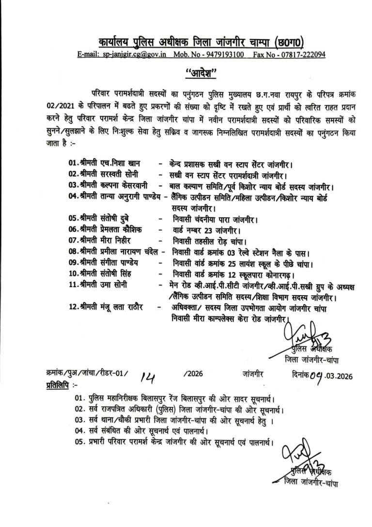 जंजगीर चांपा, 09 मार्च (आरएनएस)। पुलिस अधीक्षक विजय कुमार पाण्डेय के निर्देशन में अंतरराष्ट्रीय महिला दिवस के अवसर पर जिले में परिवार परामर्शदात्री सदस्यों का पुनर्गठन किया गया। इस पहल का उद्देश्य पीडि़त पक्ष को त्वरित राहत प्रदान करना तथा पारिवारिक विवादों और समस्याओं को सुनकर आपसी समझाइश और परामर्श के माध्यम से सुलझाना है। इसके लिए समाज में सक्रिय और जागरूक महिलाओं को परामर्शदात्री सदस्य के रूप में शामिल किया गया है, जो जरूरतमंद लोगों को नि:शुल्क परामर्श सेवा प्रदान करेंगी। इस पुनर्गठन का मुख्य उद्देश्य घरेलू और पारिवारिक विवादों को कानूनी प्रक्रिया से पहले आपसी सहमति, संवाद और समझाइश के माध्यम से हल करना, पीडि़तों को त्वरित सहायता उपलब्ध कराना तथा समाज में महिला सुरक्षा और जागरूकता को बढ़ावा देना है।