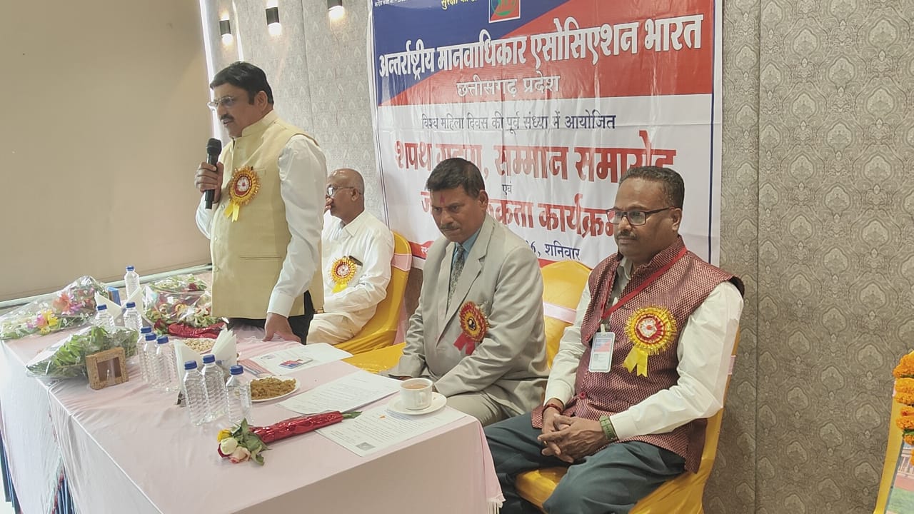 रायपुर 10 मार्च 2026(आरएनएस) विश्व महिला दिवस के अवसर पर रायपुर के होटल किंगसवे में अंतरराष्ट्रीय मानवाधिकार एसोसिएशन द्वारा भव्य शपथ ग्रहण एवं सम्मान समारोह का आयोजन किया गया। कार्यक्रम में संगठन के पदाधिकारियों और कार्यकर्ताओं ने मानवाधिकार संरक्षण तथा समाज सेवा के प्रति समर्पण का संकल्प लिया। समारोह में शहर के गणमान्य नागरिकों, सामाजिक कार्यकर्ताओं और संगठन से जुड़े सदस्यों की बड़ी संख्या में उपस्थिति रही।
