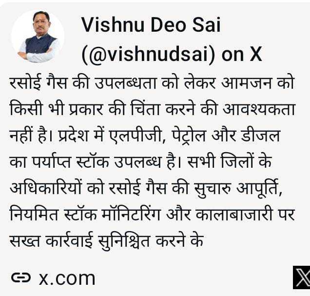 रायपुर, 10 मार्च (आरएनएस)। मुख्यमंत्री विष्णु देव साय ने कहा है कि रसोई गैस की उपलब्धता को लेकर आमजन को किसी भी प्रकार की चिंता करने की आवश्यकता नहीं है। उन्होंने कहा कि प्रदेश में एलपीजी के साथ ही पेट्रोल और डीजल का पर्याप्त स्टॉक उपलब्ध है। मुख्यमंत्री ने कहा कि राज्य में रसोई गैस की सुचारु आपूर्ति सुनिश्चित करने के लिए सभी जिलों के अधिकारियों को आवश्यक निर्देश दिए गए हैं। अधिकारियों को गैस एजेंसियों के स्टॉक की नियमित मॉनिटरिंग करने तथा आपूर्ति व्यवस्था पर सतत नजर रखने को कहा गया है। मुख्यमंत्री श्री साय ने यह भी निर्देश दिए हैं कि यदि कहीं कालाबाजारी या अनियमितता की शिकायत प्राप्त होती है तो संबंधित के विरुद्ध सख्त कार्रवाई सुनिश्चित की जाए। मुख्यमंत्री ने प्रदेशवासियों से अपील करते हुए कहा है कि किसी भी प्रकार की अफवाहों पर ध्यान न दें और आवश्यकता के अनुसार ही रसोई गैस की बुकिंग करें। उन्होंने कहा कि सरकार नागरिकों को आवश्यक वस्तुओं की उपलब्धता सुनिश्चित करने के लिए पूरी तरह सतर्क है।