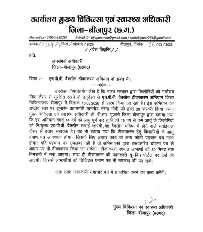 बीजापुर, 16 मार्च (आरएनएस)। जिले में किशोरियों को गर्भाशय ग्रीवा कैंसर से सुरक्षित रखने के उद्देश्य से एचपीवी (ह्यूमन पैपिलोमा वायरस) वैक्सीन टीकाकरण अभियान 16 मार्च 2026 से प्रारंभ किया जा रहा है। यह अभियान भारत सरकार की महत्वपूर्ण स्वास्थ्य पहल का हिस्सा है, जिसके तहत जिले की पात्र किशोरियों को नि:शुल्क टीका लगाया जाएगा। मुख्य चिकित्सा एवं स्वास्थ्य अधिकारी कार्यालय से जारी प्रेस विज्ञप्ति के अनुसार इस अभियान का राष्ट्रीय स्तर पर शुभारंभ प्रधानमंत्री द्वारा 28 फरवरी को किया गया था। इसी क्रम में जिला बीजापुर में भी अभियान शुरू किया जा रहा है। अभियान के तहत 14 वर्ष की आयु पूर्ण कर चुकी तथा 15 वर्ष से कम आयु की किशोरियों को एचपीवी वैक्सीन लगाई जाएगी। यह टीका भविष्य में होने वाले सर्वाइकल (गर्भाशय ग्रीवा) कैंसर से बचाव में सहायक माना जाता है। टीकाकरण के लिए किशोरियों को आयु प्रमाण पत्र प्रस्तुत करना आवश्यक होगा, जिसके लिए आधार कार्ड या अन्य मान्य पहचान पत्र स्वीकार किए जाएंगे। यदि पहचान पत्र उपलब्ध नहीं है तो अभिभावक द्वारा हस्ताक्षरित घोषणा पत्र के आधार पर भी टीकाकरण किया जा सकेगा। टीकाकरण के बाद लाभार्थियों को 30 मिनट तक निगरानी में रखा जाएगा। साथ ही टीकाकरण की पूरी जानकारी यू-विन पोर्टल पर दर्ज की जाएगी, जिससे लाभार्थियों को डिजिटल प्रमाण पत्र भी उपलब्ध कराया जा सकेगा। मुख्य चिकित्सा एवं स्वास्थ्य अधिकारी ने जिले के नागरिकों से अपील की है कि वे इस अभियान की जानकारी अधिक से अधिक किशोरियों और उनके अभिभावकों तक पहुंचाएं, ताकि सभी पात्र किशोरियां इस टीकाकरण का लाभ लेकर गंभीर बीमारी से सुरक्षित रह सके।