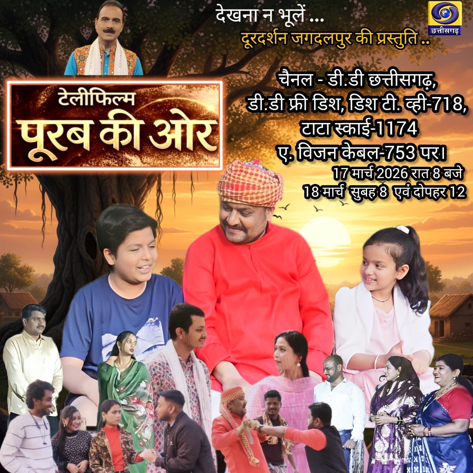 जगदलपुर 16 मार्च ( आरएनएस)क्षेत्रीय संस्कृति और पारिवारिक मूल्यों पर आधारित टेलीफिल्म “पूर्व की ओर” का प्रसारण दूरदर्शन जगदलपुर द्वारा किया जाएगा। दूरदर्शन की इस विशेष प्रस्तुति का प्रसारण डी.डी. छत्तीसगढ़ चैनल पर किया जाएगा, जिसे दर्शक विभिन्न डीटीएच और केबल नेटवर्क के माध्यम से देख सकेंगे।