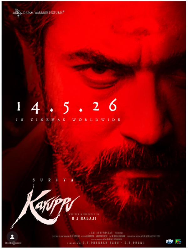 फिल्म मेकर्स ने इंस्टाग्राम हैंडल पर करुप्पु से सूर्या का एक खास पोस्टर शेयर किया और साथ ही इसकी रिलीज डेट से पर्दा उठाया। उन्होंने लिखा जो लोग सूर्या की फिल्म करुप्पु की रिलीज का इंतजार कर रहे थे, वो आ गई है। करुप्पु 14 मई 2026 को सिनेमाघरों में रिलीज होगी।