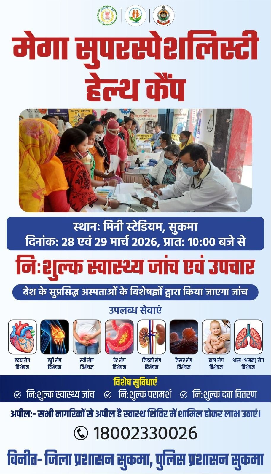 सुकमा,21 मार्च (आरएनएस)। नक्सल प्रभावित और दूरस्थ क्षेत्रों में स्वास्थ्य सेवाओं की कमी को दूर करने के उद्देश्य से जिला प्रशासन सुकमा द्वारा एक सराहनीय पहल करते हुए 28 एवं 29 मार्च को मिनी स्टेडियम, सुकमा में मेगा सुपरस्पेशलिटी हेल्थ कैंप का आयोजन किया जा रहा है। यह शिविर प्रतिदिन प्रात: 10 बजे से प्रारंभ होगा।जिला प्रशासन के तत्वाधान में आयोजित इस दो दिवसीय शिविर में देश के सुप्रसिद्ध अस्पतालों के अनुभवी एवं विशेषज्ञ चिकित्सकों की टीम भाग लेगी। इस दौरान ग्रामीणों एवं शहरवासियों को एक ही स्थान पर विभिन्न गंभीर बीमारियों के विशेषज्ञों से परामर्श एवं उपचार की सुविधा उपलब्ध होगी। इस स्वास्थ्य शिविर में हृदय रोग, हड्डी रोग, स्त्री रोग, पेट संबंधी रोग, किडनी रोग, कैंसर, बाल रोग तथा श्वास संबंधी रोगों के विशेषज्ञ चिकित्सक अपनी सेवाएं देंगे। विशेष बात यह है कि इस पूरे आयोजन में स्वास्थ्य जांच, चिकित्सकीय परामर्श और दवाओं का वितरण पूरी तरह नि:शुल्क किया जाएगा।जिला प्रशासन का यह प्रयास उन लोगों के लिए अत्यंत लाभकारी सिद्ध होगा, जो दूरस्थ क्षेत्रों में रहने के कारण बेहतर स्वास्थ्य सुविधाओं से वंचित रह जाते हैं। शिविर के माध्यम से न केवल रोगों की समय पर पहचान होगी, बल्कि गंभीर बीमारियों के लिए आगे की उपचार प्रक्रिया भी सुनिश्चित की जाएगी। जिला प्रशासन एवं पुलिस प्रशासन सुकमा ने अधिक से अधिक लोगों से इस स्वास्थ्य शिविर का लाभ उठाने की अपील की है। यह पहल क्षेत्र में स्वास्थ्य जागरूकता बढ़ाने और आम नागरिकों को बेहतर जीवन देने की दिशा में एक महत्वपूर्ण कदम माना जा रहा है।