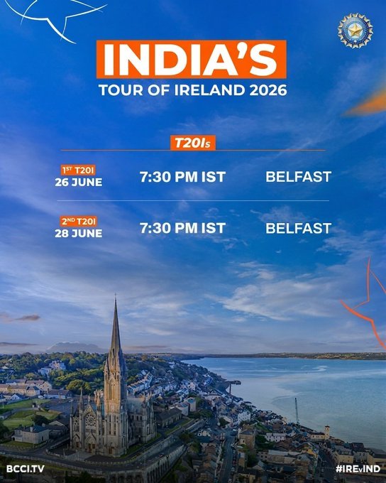 टी20 के दोनों मुकाबले बेलफास्ट में होंगे. इस संबंध में बीसीसीआई ने बताया कि 2007 के बाद ऐसा पहली बार होगा जब भारतीय टीम बेलफास्ट में मुकाबले खेलेगी. भारत और आयरलैंड के बीच पहला टी20 मुकाबला 26 जून और दूसरा टी20 28 जून 2026 को होगा. भारतीय समयानुसार ये मैच शाम साढ़े सात बजे से शुरू होंगे.
