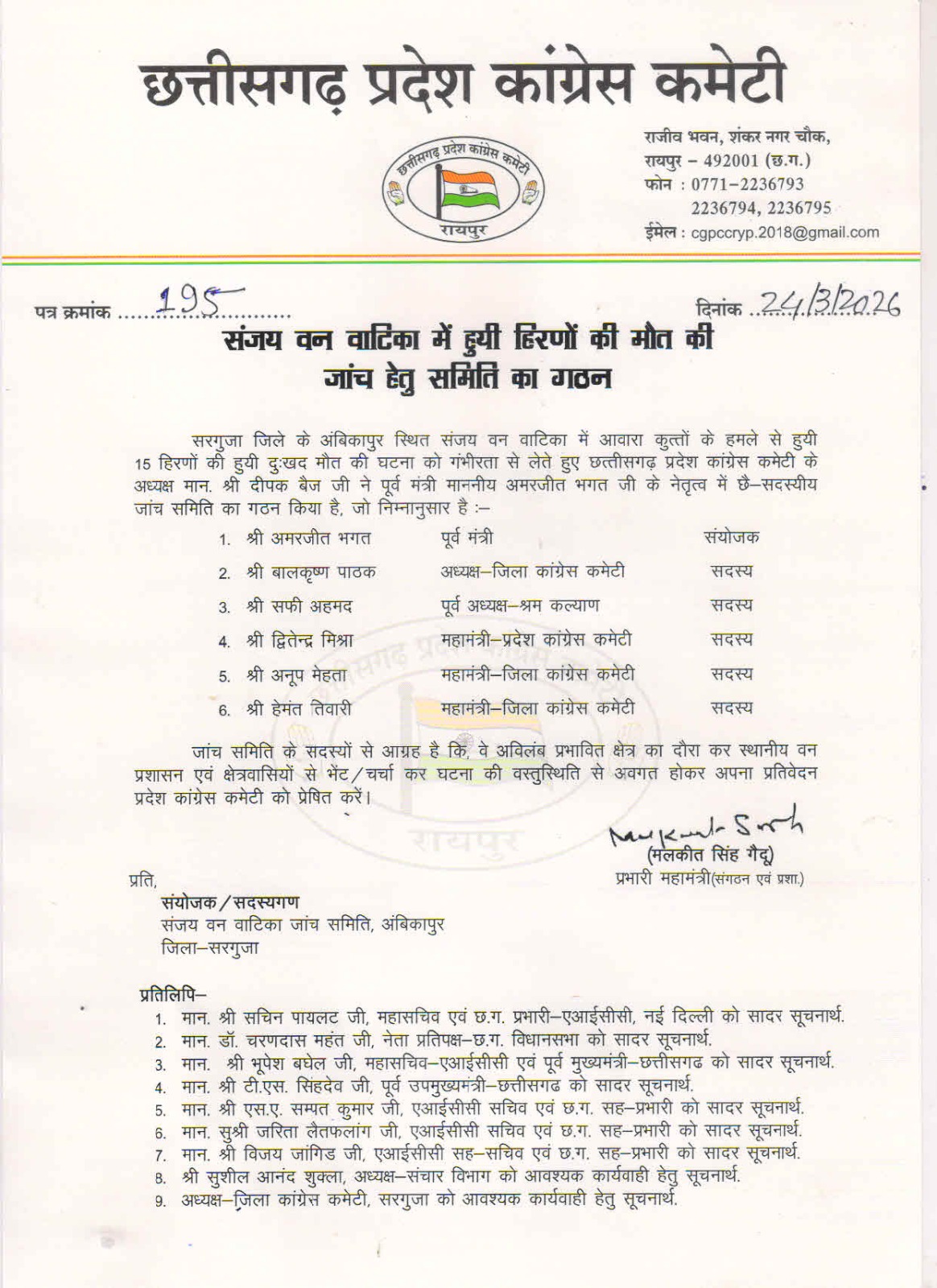रायपुर/अंबिकापुर, 24 मार्च (आरएनएस)। अंबिकापुर स्थित संजय वन वाटिका में हिरणों की मौत के मामले को लेकर छत्तीसगढ़ प्रदेश कांग्रेस कमेटी ने गंभीर रुख अपनाया है। इस घटना की जांच के लिए कांग्रेस ने 6 सदस्यीय जांच समिति का गठन किया है। जारी आदेश के अनुसार, इस समिति का नेतृत्व पूर्व मंत्री अरुणजीत भगत करेंगे। उनके साथ जिला कांग्रेस अध्यक्ष बालकृष्ण पाठक, पूर्व श्रम कल्याण अध्यक्ष सफी अहमद, प्रदेश कांग्रेस महामंत्री हितेन्द्र मिश्रा, जिला कांग्रेस महामंत्री अनूप मेहता और हेमंत तिवारी को सदस्य बनाया गया है। बताया गया है कि अंबिकापुर के संजय वन वाटिका में आवारा कुत्तों के हमले में करीब 15 हिरणों की मौत हो गई थी। इस घटना को कांग्रेस ने गंभीरता से लेते हुए तत्काल जांच समिति गठित की है। समिति को निर्देश दिए गए हैं कि वे मौके पर जाकर वन विभाग के अधिकारियों और स्थानीय लोगों से चर्चा करें, घटना की वास्तविक स्थिति का पता लगाएं और जल्द से जल्द अपनी रिपोर्ट प्रदेश कांग्रेस कमेटी को सौंपें। इस कार्रवाई को वन्यजीव संरक्षण और प्रशासनिक जिम्मेदारी तय करने की दिशा में एक महत्वपूर्ण कदम माना जा रहा है।