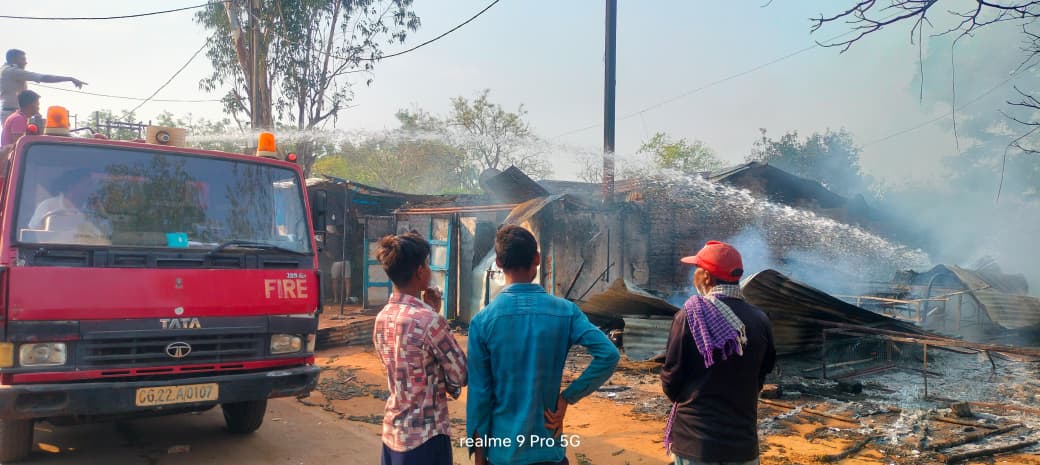 बलौदाबाज़ार 27 मार्च 2026(आरएनएस) गिरौदपुरी मंदिर परिसर के पास 27 मार्च 2026 की सुबह एक ट्रांसफार्मर में अचानक लगी आग ने कुछ ही मिनटों में विकराल रूप ले लिया और आसपास की करीब 10 दुकानों को अपनी चपेट में ले लिया। कपड़े, साड़ी और लकड़ी से बनी दुकानों में आग तेजी से फैलती गई, लेकिन सूचना मिलते ही गिरौदपुरी पुलिस चौकी की टीम मौके पर पहुंची और चौकी प्रभारी उपनिरीक्षक अश्वनी पडवार के नेतृत्व में पुलिस ने स्थानीय लोगों के साथ मिलकर आग बुझाने की कार्रवाई तुरंत शुरू कर दी।