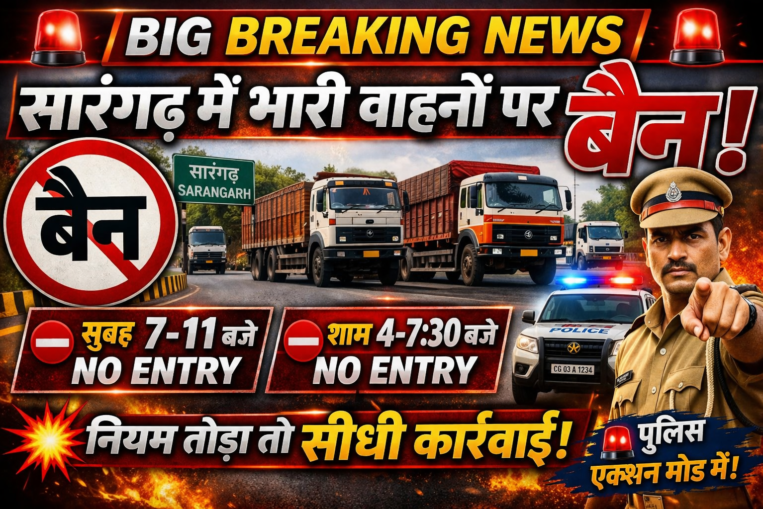 सारंगढ़ बिलाईगढ़, 27 मार्च 2026 (आरएनएस ) सारंगढ़ नगर में सड़क दुर्घटना से बचाव एवं लोक सुरक्षा को ध्यान में रखते हुए कार्यालय कलेक्टर एवं जिला दंडाधिकारी सारंगढ़ बिलाईगढ़ द्वारा भारी वाहनों के आवागमन को नियंत्रित किया है। जारी आदेश अनुसार सारंगढ़ में सुबह 7 से 11 और शाम 4 से 7.30 बजे तक भारी वाहनों का प्रवेश प्रतिबंधित है। इस आदेश का उल्लंघन करने वाले चालकों के विरुद्ध प्रासंगिक प्रावधानों के अंतर्गत दंडात्मक कार्रवाई की जाएगी। यह आदेश तत्काल प्रभाव से लागू है।