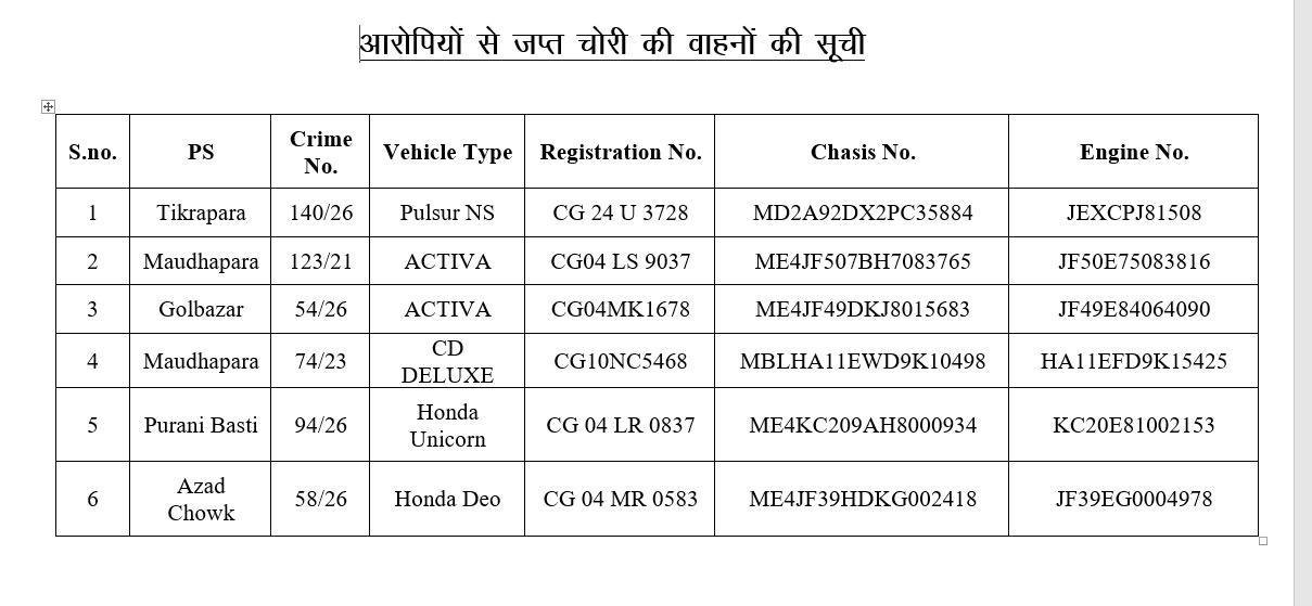 आरोपियों के कब्जे से बरामद वाहनों में टिकरापारा, गोलबाजार, मौदहापारा, पुरानी बस्ती और आजाद चौक थाना क्षेत्रों में दर्ज मामलों की गाड़ियां शामिल हैं। इन मामलों में टिकरापारा थाना में अपराध क्रमांक 140/26 धारा 305 बीएनएस सहित अन्य थानों में अलग-अलग अपराध दर्ज हैं।