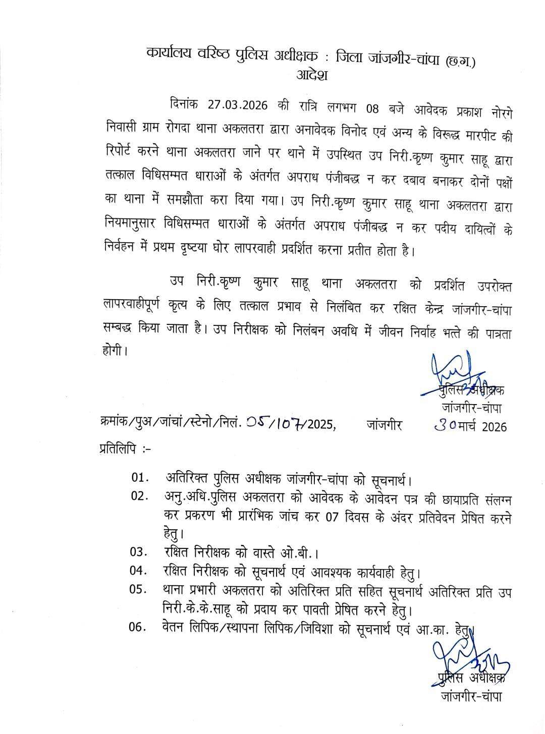 इस लापरवाही को गंभीर मानते हुए वरिष्ठ पुलिस अधीक्षक विजय कुमार पांडेय ने स्ढ्ढ कृष्ण कुमार साहू को तत्काल प्रभाव से निलंबित कर दिया है। निलंबन अवधि में उन्हें नियमानुसार जीवन निर्वाह भत्ता दिया जाएगा। साथ ही मामले की प्रारंभिक जांच के आदेश दिए गए हैं और 7 दिनों के भीतर रिपोर्ट प्रस्तुत करने को कहा गया है। इस कार्रवाई के बाद पुलिस विभाग में हड़कंप मच गया है और कार्यप्रणाली को लेकर एक बार फिर सवाल उठने लगे हैं।