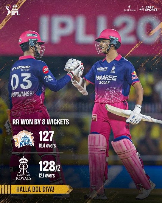 नईदिल्ली,31 मार्च। इंडियन प्रीमियर लीग 2026 के तीसरे मैच में राजस्थान रॉयल्स ने चेन्नई सुपर किंग को 8 विकेट से मात देकर अपने अभियान का शानदार आगाज किया. राजस्थान ने पहले खतरानक गेंदबाजी का प्रदर्शन करते हुए सीएसके को 127 पर ही ढेर कर दिया और फिर बल्लेबाजी में वैभव सूर्यवंशी के तूफानी अर्धशतक (17 गेंद में 52 रन) की बदौलत 12.1 ओवर में ही 2 विकेट खोकर लक्ष्य को आसानी से हासिल कर लिया.