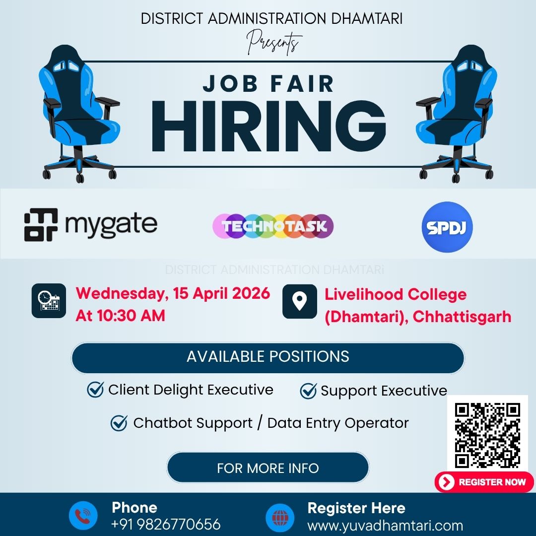 धमतरी,01 अप्रैल (आरएनएस)। जिले के युवाओं को रोजगार उपलब्ध कराने के लिए अब 15 अप्रैल को लाईवलीहुड कॉलेज धमतरी में रोजगार मेला का आयोजन किया जाएगा। सहायक परियोजना अधिकारी, जिला परियोजना लाईवलीहुड कॉलेज धमतरी ने बताया कि पूर्व में यह रोजगार मेला 10 अप्रैल को आयोजित होना था, जिसमें संशोधन किया गया है। अब यह रोजगार मेला 15 अप्रैल को आयोजित होगा। रोजगार मेला में शामिल होने के इच्छुक युवा निर्धारित पॉम्पलेट में दिए गए लिंक पर ऑनलाईन पंजीयन करा सकते हैं।रोजगार मेला में निजी संस्था के नियोक्ताओं द्वारा क्लाईंट डिलाईट एक्जीक्यूटिव और डाटा एंट्री ऑपरेटर के 50-50 तथा सपोर्ट एक्जीक्यूटिव के 100 पदों, इस तरह कुल 200 पदों पर भर्ती की जाएगी। कलेक्टर सह अध्यक्ष जिला परियोजना लाईवलीहुड कॉलेज अबिनाश मिश्रा ने जिले के विभिन्न महाविद्यालयों के प्राचार्यों को निर्देशित किया है कि वे अपनी संस्थान से शिक्षा प्राप्त कर चुके या अध्ययनरत युवाओं का समुचित परामर्श कर इच्छुक युवओं को प्रस्तावित रोजगार मेला में सम्मिलित करना सुनिश्चित करें। साथ ही इच्छुक युवाओं की सूची 06 अप्रैल तक लाईवलीहुड कॉलेज धमतरी में उपलब्ध कराना कराएं।